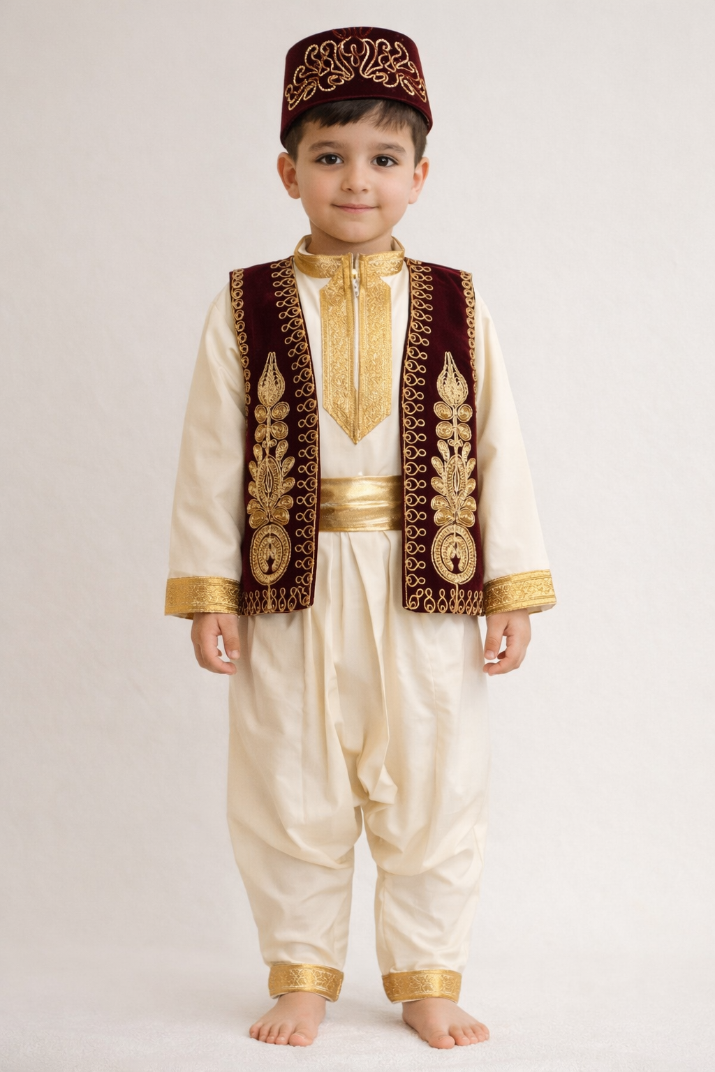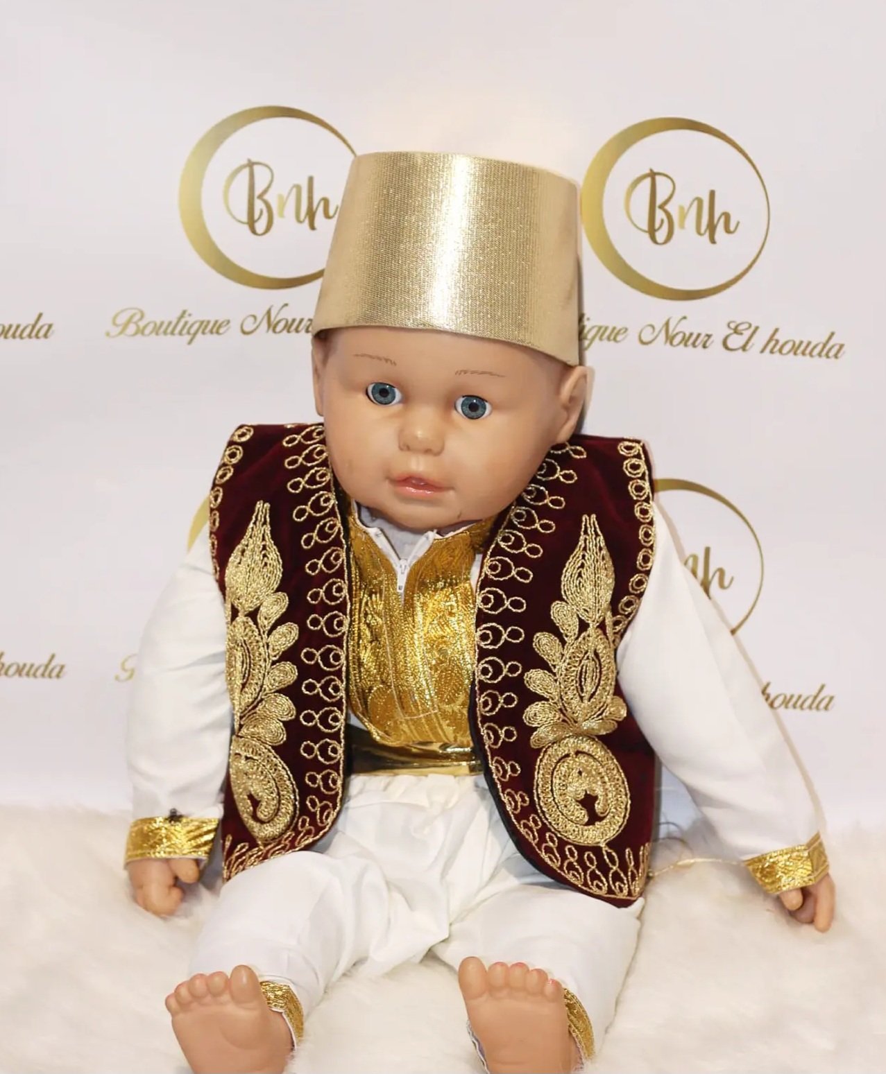 طقم ختان عاصمي تقليدي اللون ڨرونة متكون من 5 قطع. سروال. شوميز. حزام. جيلي. طربوش